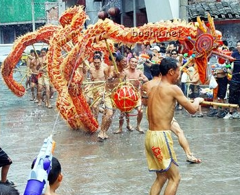 如今已發(fā)展成為對喜慶節(jié)日的慶祝,對美好生活祝福的一種方式。它用鮮棕葉作龍須,用葛藤、黃荊條、松樹枝作龍身,分9節(jié)、11節(jié)、1 3節(jié)、15節(jié)等不同長度的奇數(shù),由9至15人參加舞龍。伴著鑼、鼓、鎖吶的鏗鏘樂曲,一人持“寶”在前,龍舞歡騰時有“二龍搶寶”、“蛇蛻皮”、“烏龍絞柱”等50多種動作玩法。與此同時,身著民族服裝的群眾用臉盆、水瓢、銻桶等容器端水圍繞著龍潑澆,這樣邊舞邊潑水、水潑得越多龍舞得越歡,也預(yù)祝大家當(dāng)年風(fēng)調(diào)雨順,五谷豐登,其場面歡樂喜慶,風(fēng)趣幽默。已列入我市第一批非物質(zhì)文化遺產(chǎn)保護名錄。