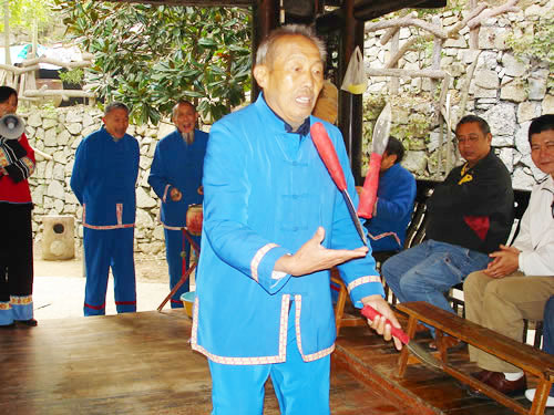 三棒鼓,是以拋三根棒和敲鑼打鼓得名,是土家山寨到處可見的一項以打擊樂器、口頭文學(xué)、表演技藝合為一體的文體活動形式。 打三棒鼓通常由三至五人組成,師傅擊鼓唱詞,一人打鑼,一人;ò、花刀。由一人表演,將鼓架擺在前面鼓架上,將鑼掛在鼓架下面,用細繩系著鑼棒套在腳板上,表演時,口唱詞、手打鼓、腳踩鑼,鑼鼓節(jié)拍是按拋花棒、花刀速度的需要而定。三棒鼓的唱詞是五言四句重復(fù)半句組成。即五字一句,四句為一節(jié)。每小節(jié)的第四句要重復(fù)半句。每一小節(jié)擊響鑼鼓四遍。前三句是每唱完擊三響,最后一句唱完即每小節(jié)結(jié)束時擊響十下。例如唱:"學(xué)打三棒鼓",打"鏘鏘鏘";唱"學(xué)又學(xué)得苦",打"鏘鏘鏘";唱"三歲學(xué)到一十五",打"鏘鏘鏘";唱"學(xué)起呀,學(xué)起走江湖",打"鏘鏘鏘、鏘、鏘、鏘鏘鏘鏘鏘-鏘"。這一小節(jié),每唱一字為一拍,"鏘"為鑼鼓同鳴聲,每聲占一拍,標點符號也占一拍。每拍的快慢取決于花棒下落的速度,任何一個花棒下落一次均為一拍。因此,如果花棒拋得低,下落的頻率就快,每拍所占時間就短,反之,花棒拋得高,每拍占的時間就長。三棒鼓的第二句和第四句都要求壓韻,一句和三句可壓可不壓. 打三棒鼓的技巧性很強,思想要高度集中,拋刀拋棒用力要適度,動作要敏捷準確,稍有疏忽大意,不但表演失敗,還會被刀劃破手腳或誤傷他人。因此,凡是學(xué)打三棒鼓者,均需經(jīng)常練習(xí)飛拋接技術(shù),做到閉目均能拋接刀棒。因此,土家族青少年經(jīng)常用三個卵石練習(xí)拋接技術(shù),久而久之,熟能生巧,不但會拋棒,而且能拋刀。 打三棒鼓的鑼鼓曲牌不變,但唱詞多種多樣,除了固定的《十二月花》等唱詞外,均為即興編詞隨口而唱,唱三棒鼓歌的人,都是腦筋靈活、口才伶俐者。 |