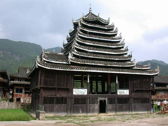 位于通道侗族自治縣坪陽(yáng)鄉(xiāng)田心寨境內(nèi),始建于清順治年間,為侗族獨(dú)特建筑。方形二層樓閣,九層八柱,木結(jié)構(gòu)。邊寬8米,高20米。頂蓋為八角形,上托葫蘆寶頂。封檐板與樓內(nèi)大梁彩繪民間圖畫(huà),各檐翹角飾禽獸浮雕。底層設(shè)火塘,四周置木凳。二樓正面系活動(dòng)板壁,可兼做戲臺(tái)。