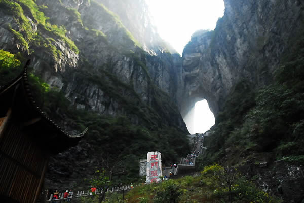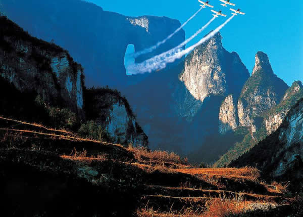 天門洞風(fēng)光圖片 天門洞景觀 1700多年來,這一道奇絕天下的勝景吸引著無數(shù)的探訪者趨之若鶩。特別是在1999年,世界特技飛行大師駕機穿越天門洞,在全球引發(fā)了轟動效應(yīng),收看現(xiàn)場直播的觀眾達到8億之多。