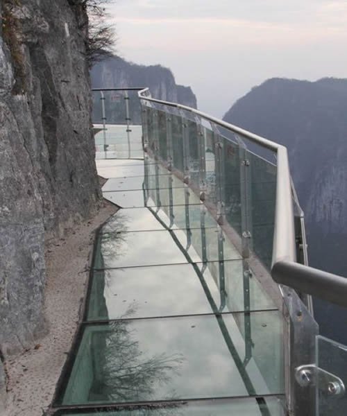 2011年10月1日,張家界天門山國(guó)家森林公園新建的玻璃棧道正式對(duì)游客開(kāi)放。玻璃棧道懸于天門山頂西線,長(zhǎng)60米,最高處海拔1430米。是張家界天門山景區(qū)繼懸于峭壁之上的鬼谷棧道、憑空伸出的玻璃眺望臺(tái)、從玻璃臺(tái)可以看見(jiàn)下面。玻璃臺(tái)伸出棧道有4-5米,專供游人拍照、橫跨峽谷的木質(zhì)吊橋后打造的又一試膽力作。為了讓游客零瑕疵的透過(guò)玻璃橋看到美麗的風(fēng)景,上橋的游客均要求戴上鞋套,以保持玻璃橋的透明和干凈。玻璃棧道的刺激震撼,可與舉世聞名的美國(guó)大峽谷玻璃走廊“天空之路”媲美,因而有了東方“天空之路”的美譽(yù)。