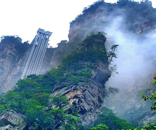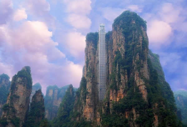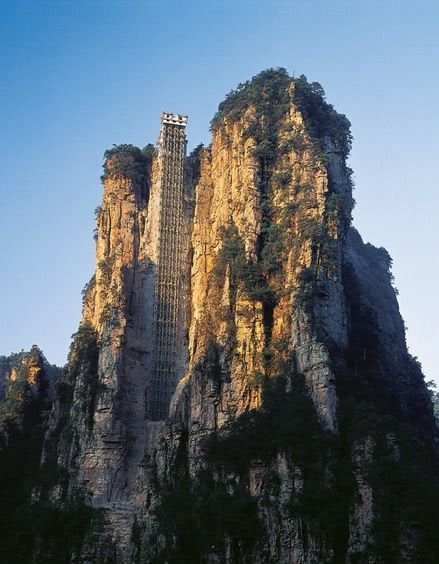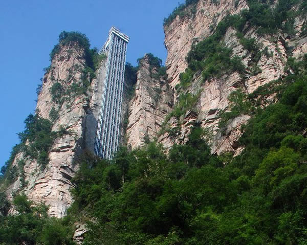 百龍電梯圖片 百龍?zhí)焯輾鈩莼趾,垂直高?35米,運行高度326米,由154米山體內(nèi)堅井和172米貼山鋼結(jié)構(gòu)井架等組成,采用三臺雙層全暴露觀光電梯并列分體運行,每臺次載客50人次,運行速度3米/秒,三臺同時運行每小時往返量達4000人次。百龍?zhí)焯莸男藿▽崿F(xiàn)“山上游,山下住”的目標,提供了交通保障,將袁家界天下第一橋、迷魂臺、天懸白練以及烏龍寨、楊家界等絕世美景從幕后推向了前臺,并將天子山、袁家界、金鞭溪等精品旅游線路連為一體,解決了多年困擾景區(qū)的交通瓶頸問題。
