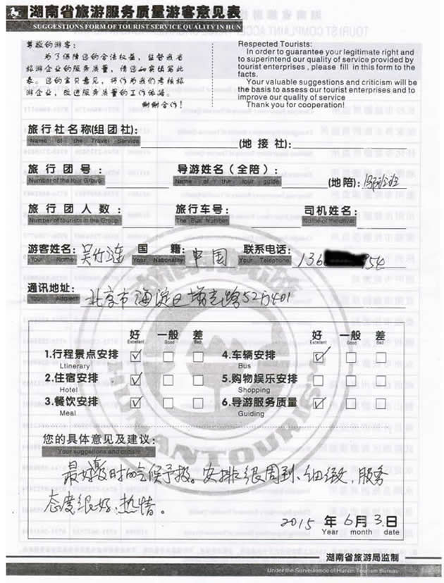 5月下旬,北京吳先生一行四位貴賓與湖南西部(張家界)中國國際旅行社工作人員——王丹取得聯(lián)系,經(jīng)過商談,雙方達成協(xié)議并簽訂旅游合同,于6月3日抵達張家界,開始張家界之旅。此次行程是由我社優(yōu)秀導游——烏玲玲,負責旅游接待工作,烏導在旅游過程中講解詳細,客人也很滿意,在意見表上寫到:最好有及時的天氣預報,安排很周到,細致,服務態(tài)度很好,很熱情!同時也感謝吳先生選擇湖南西部(張家界)中國國際旅行社,以及您對湖南西部國旅的信任與支持。我們會繼續(xù)努力,做好旅游接待工作。期待下一次與您的合作,祝您愉快!