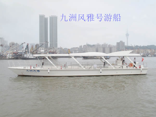 “九洲風(fēng)雅”號游船:船長23.08米,寬5.03米,擁有80客位。此船造型簡約,有很強的時尚設(shè)計感,與馬爾代夫的游船同款。