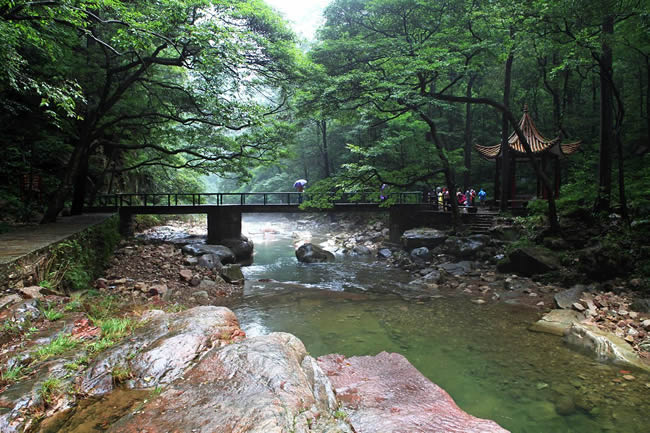 在千里相會東約250米處,有數(shù)十座翠峰環(huán)列鎖住了一塊長200多米、寬30多米的溪谷。谷內(nèi)群峰排列如屏,鱗次櫛比,相對高多在200米以上,峰體或丹巖熠熠,或灌木叢生,或古松高掛。澗壑幽邃,清溪漫流。內(nèi)有猴群攀緣,角雉啼鳴,一石擊水,四壁回音。朝陽從峰隙中射入三五道銀光,如一柄柄長劍刺入溪谷老林,光怪陸離。若遇陰雨,霧繞云蓋,一片幻影。
