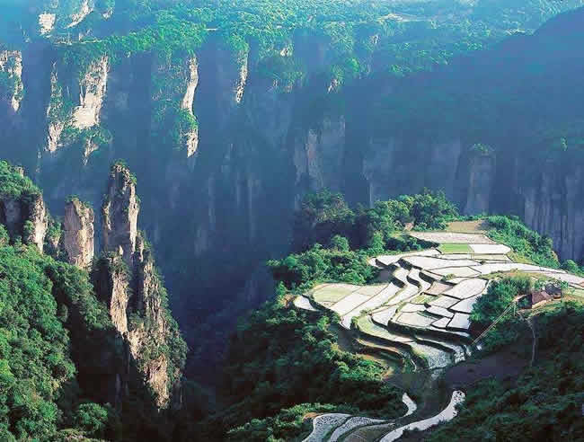 空中田園坐落在天子山莊右側經(jīng)老虎口、情人路方向兩公里處的土家寨旁,海拔1000余米。它的下面是萬丈深淵的幽空中田園谷,幽谷上有高達數(shù)百米的懸崖峭壁,峭壁上端是一塊有3公頃大的斜坡梯形良田。田園三方峰巒疊翠,林木參天,白云繚繞,活像一幅氣勢磅礴的山水畫。登上“空中田園”。清風拂袖,云霧裹身,如臨仙境,使人有青峰鳴翠鳥,高山響流泉,身在田園里,如上彩云間”之感 。