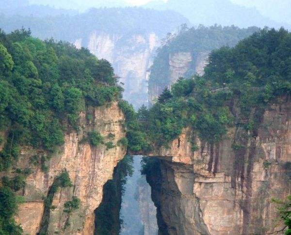 “后花園”至天下第一橋,有一條全長2000多米的游道,路面多為白色的條石鋪成,站在遠處觀望,很像一條白色的綢帶打了兩個結,一頭系在“迷魂臺”,一頭第在“天下第一橋”。信步漫游,沿途可欣賞到“拜仙臺”、“百丈絕壁”、“小洞天”、“情人谷”等別有情趣的景點,這里海拔不高,一般不受氣候影響,慢慢品味,定會使您賞心悅目!疤煜碌谝粯颉笔菑埣医纭笆蠼^景”之一。也是袁家界的標志性景點,它是居于兩山之間形成的一座天然石橋,而兩山原為一體,橋身是兩山相連的關鍵部分,但因中間石質較為薄弱,由于風化、崩塌作用的影響,又經(jīng)過日曬雨淋、流水洗刷、山洪沖擊,久而久之,終于形成今天這一特別的奇景……。自杉刀溝上袁家界,沿絕壁頂部邊緣遨游,至于中坪“觀橋臺” 遙望千米之外,只見一天然石橋凌空飛架兩峰之巔,氣勢磅礴,奇?zhèn)ソ^倫,被稱為“天下第一橋”。石橋寬僅3米,厚5米,跨度約50米,相對高度近400米。天下第一橋與夫妻巖并稱“張家界雙絕”!疤煜碌谝粯颉睒蛎鎸拑擅,厚四米,跨度為二十多米,高度為三百多米,是世界是迄今為止所發(fā)現(xiàn)落差最高的天然石橋。