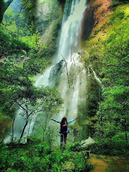 杉刀溝盡頭,有一抹泉水從200多米高的崖頂飄然而下,仿佛一匹白色長練自天而降。飛瀑下臨深潭,綠水泱泱,水霧漫漫,睛雨交加之日,時有彩虹飛升。每當山洪瀑發(fā),瀑布猶如一巨龍,飛騰傾瀉,聲若巨雷,蔚為壯觀。