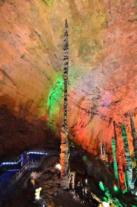 過烏龍泉東行1500米左右,一堵石壁上有一道深4米,高3米,長40多米的凹槽,凹槽上有一直徑約80厘米的洞眼,泉水從中流出。洞內(nèi)有一狹長露天石槽,高10米許,長2000多米,寬僅0.4米,游人進洞,僅可側行。走完狹槽,復入一洞,高達30多米,寬20余米,長約200米。洞壁、洞頂皆聳立或懸垂著琳瑯滿目的鐘乳石,或大或小,或長或短,淺紅,淡黃,灰白,鐵青,玲現(xiàn)剔透較大的柱狀鐘乳石400多根,均能敲出悅耳的樂音。